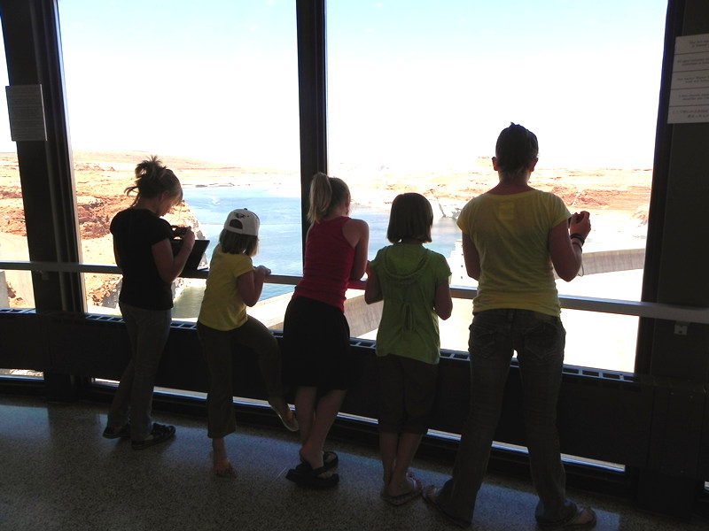 Liz, Emma, Lexi, Sarah and Maya are looking out the window at the Glen Canyon Dam and Lake Powell.