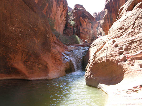 A look up the canyon. Note the rope and foot holes on the red rocks.