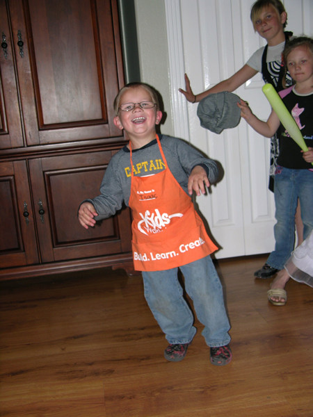 Isaac doing the 'Home Depot Shuffle'. Lizzy and Emma watch.