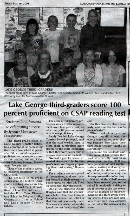 Lexi was in The Flume, the Park County Newspaper. The article is about her third grade class scoring 100 percent proficient on the state proficiency test. Read on . . .