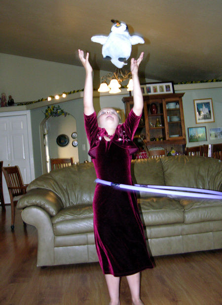 Hey, look what I can do! Throw the penguin in the air and catch it while hula hooping!