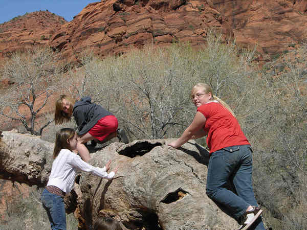 Rebecca, Sarah and Lizzy climb along a dead tree branch/trunk.