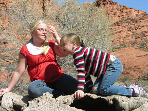 Emma has climbed up on the dead tree trunk with Rebecca. Lizzy must be out of the picture.