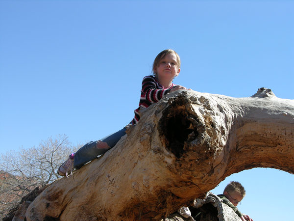 Emma likes clibing on the tree trunk. Look back, here comes Isaac.