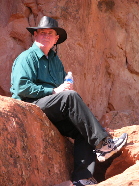 John sits on a rock, drinking water and watching the kids climb trees and red rocks.