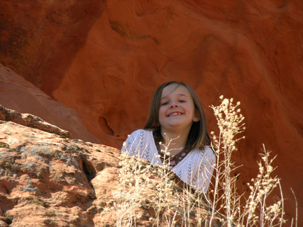 Sarah looks over ledge and grins.