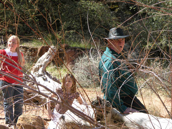 John looks back from resting on a log. In the front are Rebecca and Sarah.