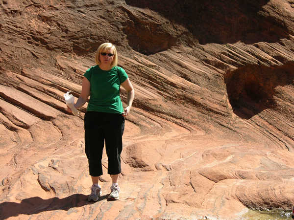 Mary stands with water bottle on cliffs.