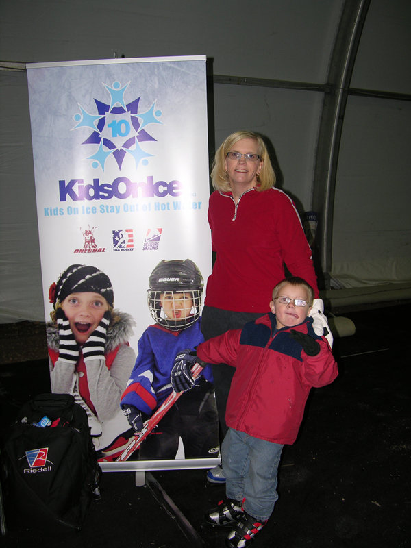 Mary and Isaac ready to get on the ice, but posed by sign for Grandma to get this picture.