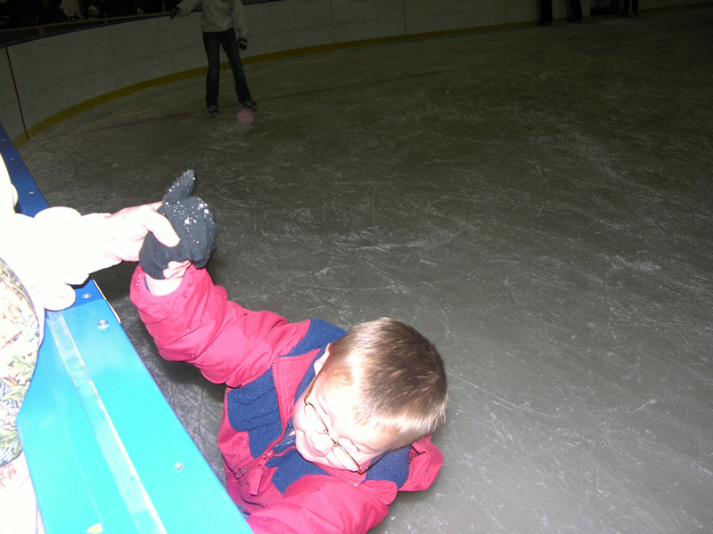 Isaac learning to stay up on his skates, but still likes to fall to eat the 'snow'!