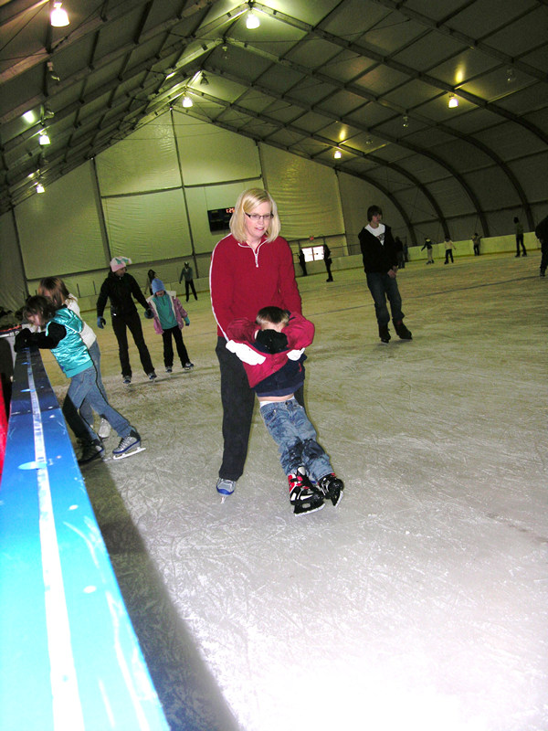 The first time Isaac has been 'camera shy'. Mary is helping him around the rink.