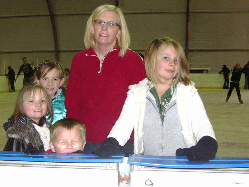 All of the skaters: Isaac in front with his eyes closed. Behind Isaac are Emma, Sarah, Mary and Lizzy.
