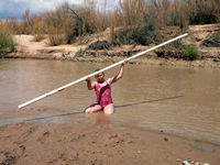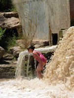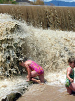 trying out the boards, we went a little upriver to the old irrigation dam.