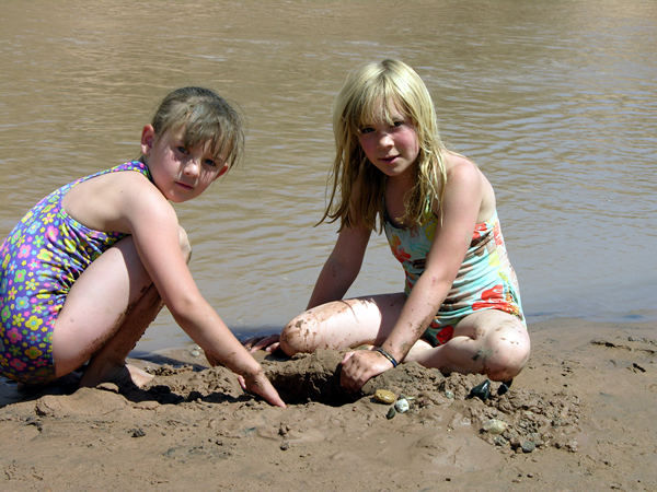 Sarah and Lexi are digging a large hole for another 'swimming pool'.