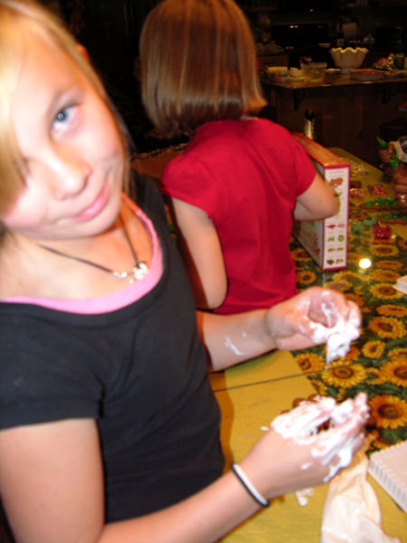 Lizzy with frosting all over her hands. It's a messy job, but somebody's