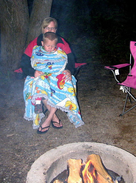 Isaac is sitting with Mom. He was asleep before the campfire started and was having a bit of difficulty waking up.