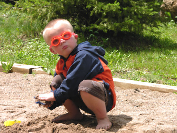 Isaac with his swimming goggles playing in the sand at 'the beach'.