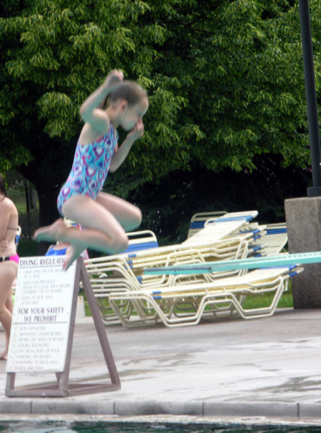 Sara is mid twisting jump off diving board.