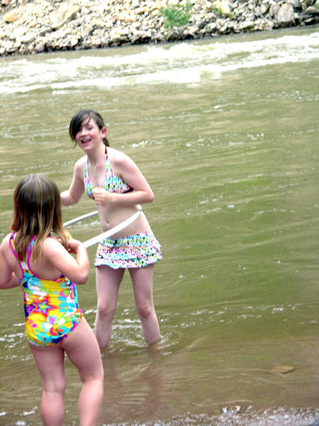 Hula hooping can go on anywhere, even in the river.