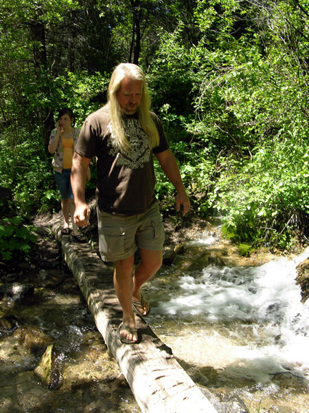 Chris crosses creek on log.