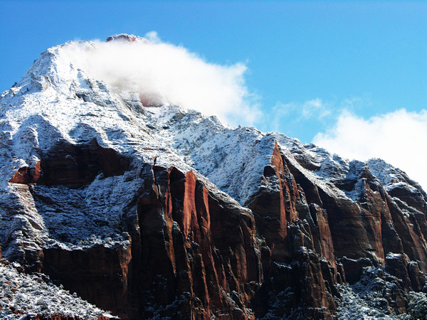 Beautiful blue sky with red rocks, snow and white clouds.