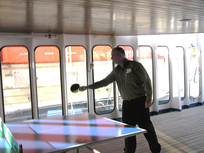 John playing ping pong aboard ship