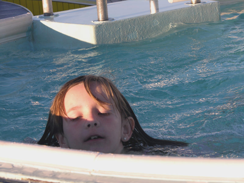 Sarah submerged in the cold pool water onboard ship.