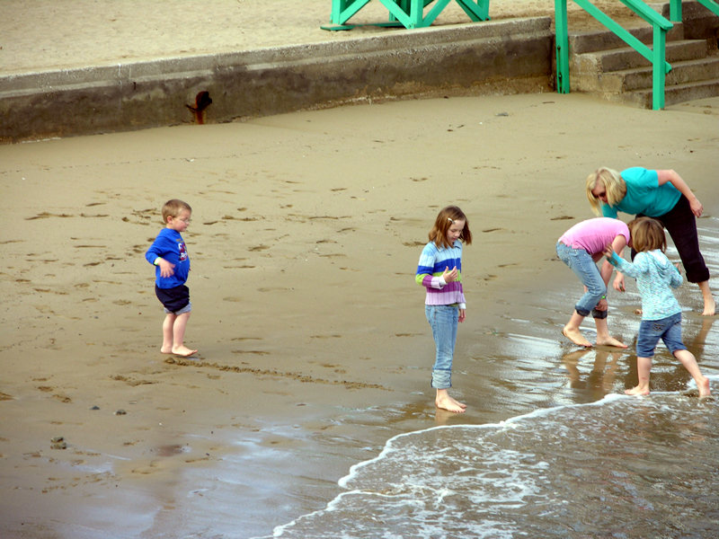 Isaac, Sarah, Lizzy, Emma and Mary collecting shells along beach on Catalina Island.