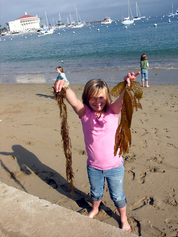 Lizzy holding up the 'catch of the day', kelp, while playing on Catalina Island.