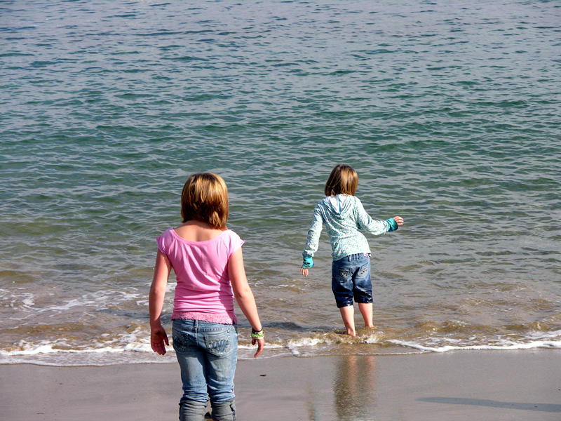 Lizzy and Emma heading out to the water at beach on Catalina Island.