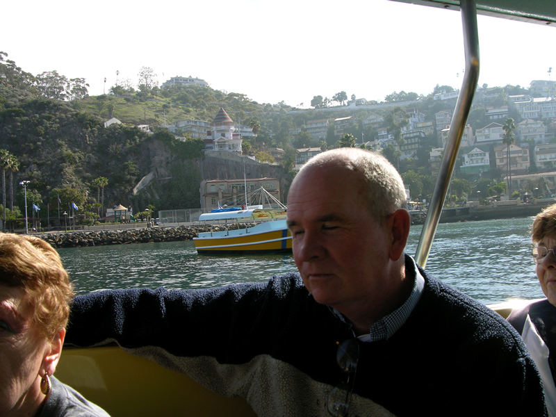 John (and Barbara barely showing) riding in boat back to Catalina on the glass bottom boat.