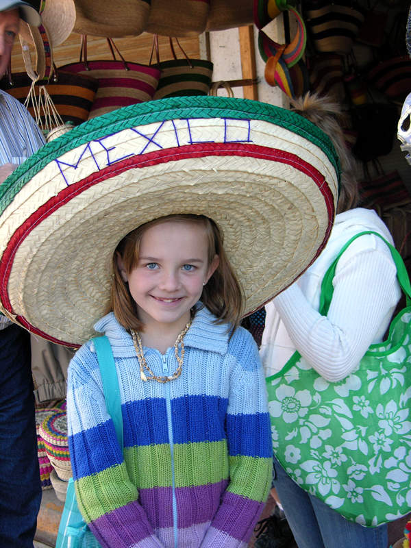 Now Sarah is wearing the sombrero. That hat is as big as she is!