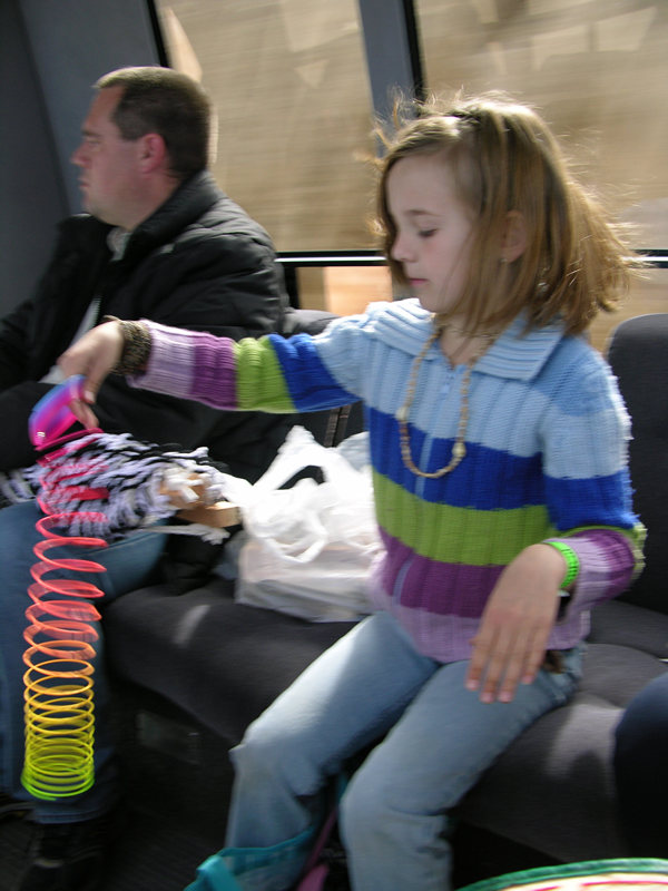 Sarah plays with he slinky on the bus back to the dock.