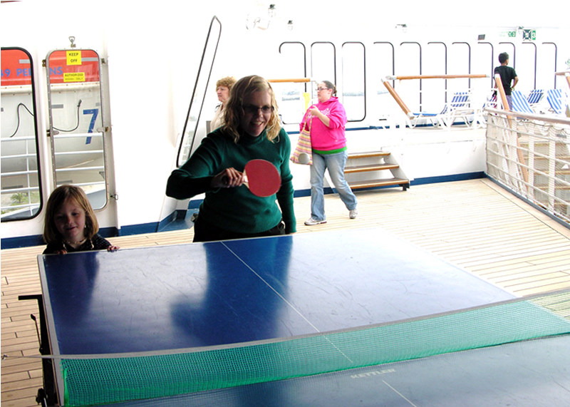 Mary plays ping pong with Emma watching while aboard ship.