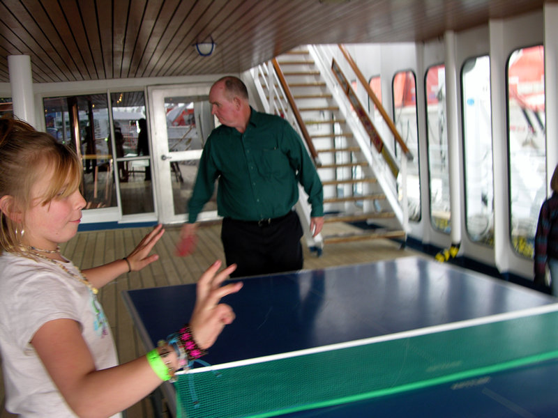 Lizzy is the score keeper while Grandpa plays ping pong.