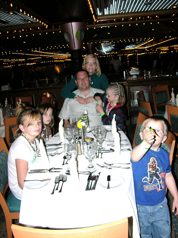 Dining on the cruise from left to right are Lizzy, Sarah, Kelton with Mary behind him,