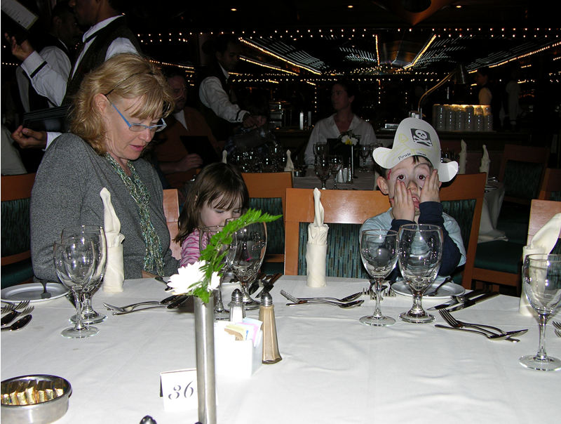 Amy with daughter Rose and son Quin waiting to be served in dining room. You can tell that Quin became a pirate at