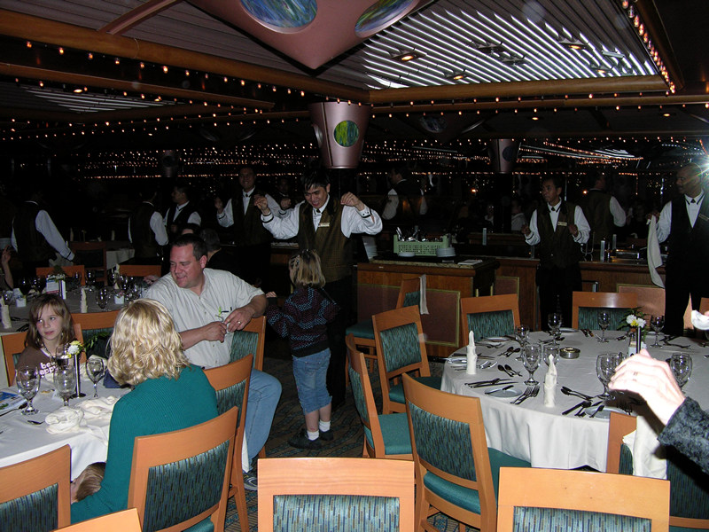 Da da da-da da-da-da! Emma gets up to join the waiters in the Chicken Dance while rest of the family looks on!