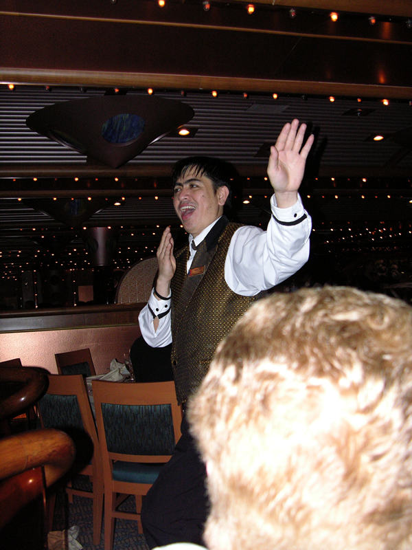 Our waiter, Ragou, dancing after the dinner was over. The waiters performed for us each night.