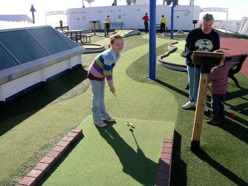 It's Sara's turn! Look at that smile! Miniature golf is fun!