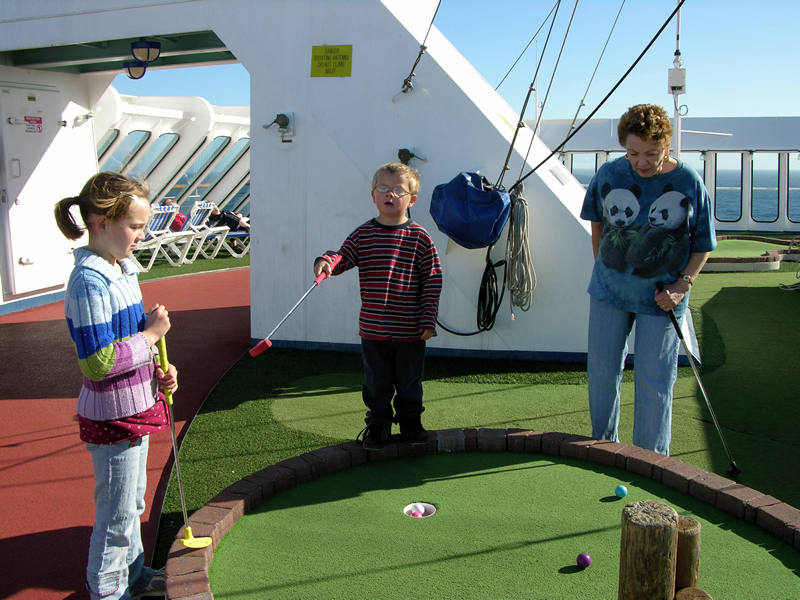 Sarah, Isaac and Barbara watch as the ball rolls toward the hole.