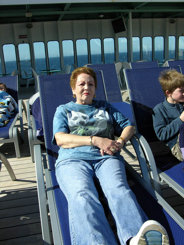 Barbara enjoys the sun as she watches the kids swim in the cold, cold water.