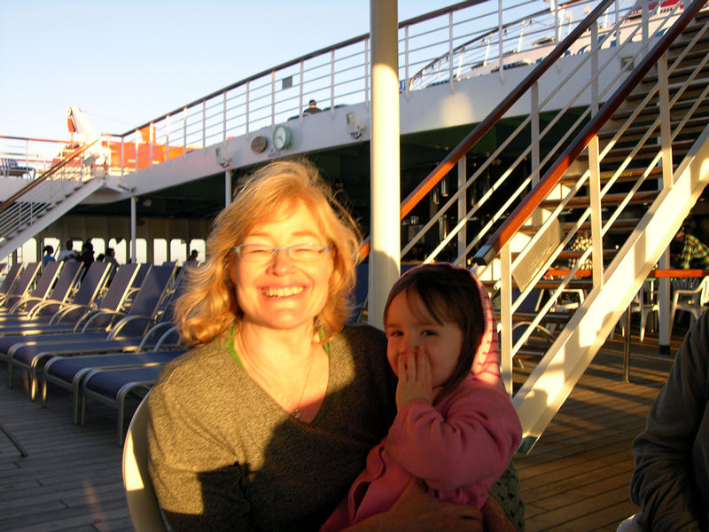 Amy holds Rose on deck. Wow! The sun is out and it is bright!