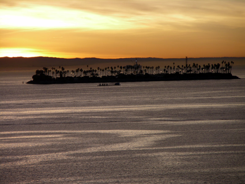 The sun commin' up, over California! You can see one of the oil islands off the coast.