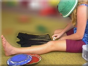our thoughts turn to costumes. Our circus theme: Glitter fabrics in water colours stimulate ideas. Parents and friends join in to help make costumes as excitement grows.